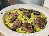 Linguine with pesto sauce, topped with flank steak overnight marinated and fried potatoes.
