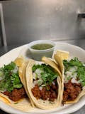 Served in a corn tortilla, topped with onions, cilantro, and salsa on the side.