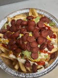 French fries and fried hot dog topped with lettuce, mustard, mayo, ketchup and aji Peruvian sauce.