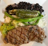 Grilled steak with jalapeños, scallions guacamole, rice and beans.