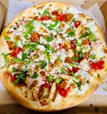 Ranch dressing base, chopped chicken cutlet, bacon, tomatoes, onions, and mozzarella cheese.